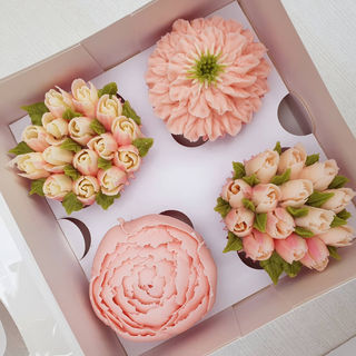 Cupcakes are available as standard or deluxe designs. All boxes are bespoke and each is priced individually but as a guide, Standard Cupcake Box Collections start at £28.50 per box of 6 cupcakes and consist of large basic flowers or large posies. They contain one shaded tinted colourway finished with cream and green. Deluxe Cupcake Collections start at £302.50 per box of 6 cupcakes and consist of a mix of usually a of large flowers, small flowers and a variety of small posies. They contain two or more tinted colourways and are finished with cream and green. Please remember that these are guide prices only and the cost of each box is dependant on its contents.